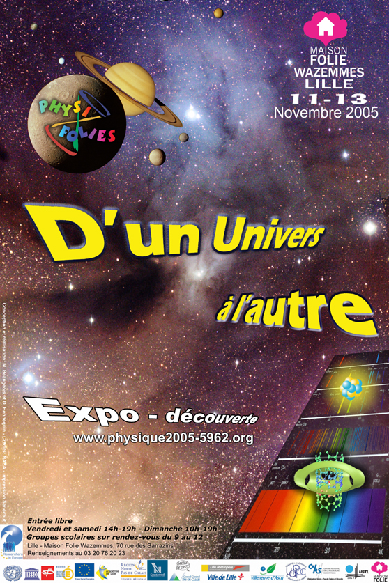 Pour cette quatrième et dernière Physifolie, l'Année Internationale de la Physique jette un pont entre l'infiniment petit et l'infiniment grand. Au fil d'une quinzaine d'animations, vous découvrirez que l'univers de l'infiniment petit a bien des points communs avec celui de l'infiniment grand, et que tous deux sont présents dans notre vie quotidienne, au travers d'applications ou de retombées technologiques. L'exposition, animée par des physiciens - étudiants, ingénieurs, enseignants, chercheurs - est aussi l'occasion de tester ses connaissances tout en s'amusant.